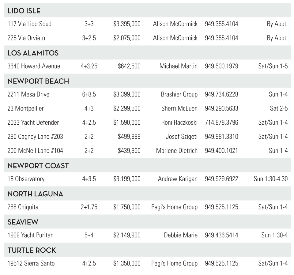 LIDO ISLE 117 ViaLido Soud 3+3 $3,395,000 Alison McCormick 949.355.4104 By Appt. 225 ViaOrvieto 3+2.5 $2,075,000 Alison McCormick 949.355.4104 By Appt. LOSA MITOS 3640 Howard Avenue 4+3.25 $642,500 Michael Martin 949.500.1979 Sat/Sun 1-5 NEWPORTBEACH 2211 Mesa Drive 6+8.5 $3,399,000 Brashier Group 949.734.6228 Sun 1-4 23 Montpellier 4+3 $2,299,500 Sherri McEuen 949.290.5633 Sat 2-5 2033 Yacht Defender 4+2.5 $1,590,000 Roni Raczkoski 714.878.3796 Sat/Sun 1-4 280 Cagney Lane #203 2+2 $499,999 Josef Szigeti 949.981.3310 Sat/Sun 1-4 200 McNeil Lane #104 2+2 $439,900 Marlene Dietrich 949.400.1021 Sun 1-4 NEWPORTCOAST 18 Observatory 4+3.5 $3,199,000 Andrew Karigan 949.929.6922 Sun 1:30-4:30 NORTH GUNA 288 Chiquita 2+1.75 $1,750,000 Pegi’sHome Group 949.525.1125 Sat/Sun 1-4 SEAVIEW 1909 Yacht Puritan 5+4 $2,149,900 Debbie Marie 949.436.5414 Sun 1:30-4 TURTLE ROCK 19512 Sierra Santo 4+2.5 $1,350,000 Pegi’sHome Group 949.525.1125 Sat/Sun 1-4