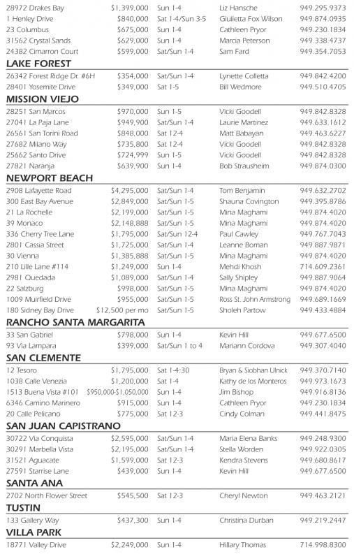 2908 Lafayette Road $4,295,000 Sat/Sun 1-4 Tom Benjamin 949.632.2702 300 East Bay Avenue $2,849,000 Sat/Sun 1-5 Shauna Covington 949.395.8786 21 La Rochelle $2,199,000 Sat/Sun 1-5 Mina Maghami 949.874.4020 39 Monaco $2,148,888 Sat/Sun 1-5 Mina Maghami 949.874.4020 336 Cherry Tree Lane $1,795,000 Sat/Sun 12-4 Paul Cawley 949.767.7043 2801 Cassia Street $1,725,000 Sat/Sun 1-4 Leanne Boman 949.887.9871 30 Vienna $1,385,888 Sat/Sun 1-5 Mina Maghami 949.874.4020 210 Lille Lane #114 $1,249,000 Sun 1-4 Mehdi Khosh 714.609.2361 2981 Quedada $1,089,000 Sat/Sun 1-4 Sally Shipley 949.887.9064 22 Salzburg $998,000 Sat/Sun 1-5 Mina Maghami 949.874.4020 1009 Muirfield Drive $955,000 Sat/Sun 1-5 Ross St. John Armstrong 949.689.1669 180 Sidney Bay Drive $12,500 per mo Sat/Sun 1-5 Sholeh Partow 949.433.4884