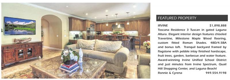FEATURED PROPERTY IRVINE $1,898,888 Toscana Residence 3 Tuscan in gated Laguna Altura. Elegant interior design features chiseled Travertine, Milestone Maple Wood flooring, custom fitted Roman Shades. 4BD/4.5BA and bonus loft. Tranquil backyard framed by flagstone with pebble inlay finished hardscape, fruit trees, garden, barbecue and water feature. Award-winning Irvine Unified School District and just minutes from Irvine Spectrum, Quail Hill Shopping Center, and Laguna Beach! Ronnie & Cyrena 949.554.9198