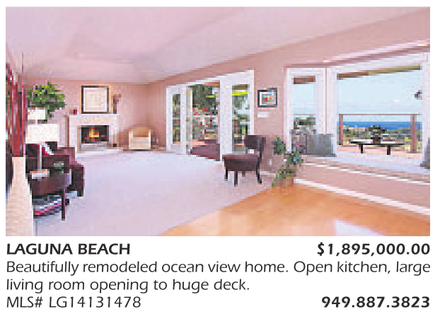 LAGUNA BEACH $1,895,000.00 Beautifully remodeled ocean view home. Open kitchen, large living room opening to huge deck. MLS# LG14131478 949.887.3823