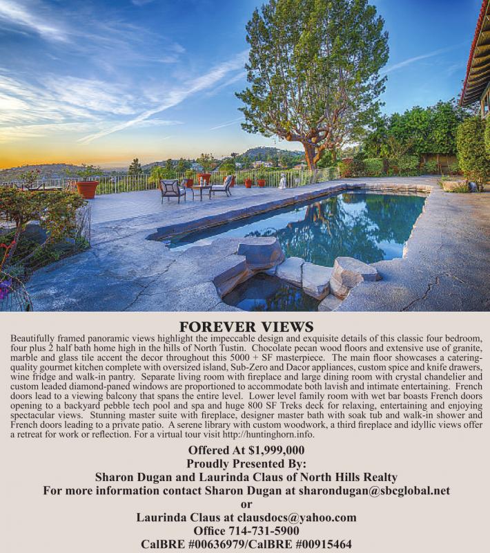 FOREVER VIEWS Beautifully framed panoramic views highlight the impeccable design and exquisite details of this classic four bedroom, four plus 2 half bath home high in the hills of North Tustin. Chocolate pecan wood floors and extensive use of granite, marble and glass tile accent the decor throughout this 5000 + SF masterpiece. The main floor showcases a cateringquality gourmet kitchen complete with oversized island, Sub-Zero and Dacor appliances, custom spice and knife drawers, wine fridge and walk-in pantry. Separate living room with fireplace and large dining room with crystal chandelier and custom leaded diamond-paned windows are proportioned to accommodate both lavish and intimate entertaining. French doors lead to a viewing balcony that spans the entire level. Lower level family room with wet bar boasts French doors opening to a backyard pebble tech pool and spa and huge 800 SF Treks deck for relaxing, entertaining and enjoying spectacular views. Stunning master suite with fireplace, designer master bath with soak tub and walk-in shower and French doors leading to a private patio. A serene library with custom woodwork, a third fireplace and idyllic views offer a retreat for work or reflection. For a virtual tour visit http://huntinghorn.info. Offered At $1,999,000 Proudly Presented By: Sharon Dugan and Laurinda Claus of North Hills Realty For more information contact Sharon Dugan at sharondugan@sbcglobal.net or Laurinda Claus at clausdocs@yahoo.com Office 714-731-5900 CalBRE #00636979/CalBRE #00915464
