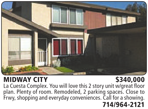 MIDWAY CITY $340,000 La Cuesta Complex. Youwill love this 2story unit w/great floor plan. Plenty of room. Remodeled, 2parking spaces. Close to Frwy,shoppingand everyday conveniences. Call forashowing.