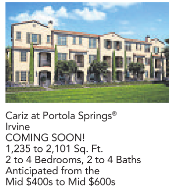 Cariz at Portola Springs ® Irvine COMING SOON! 1,235 to 2,101 Sq. Ft. 2to4Bedrooms, 2to4Baths Anticipated from the Mid $400s to Mid $600s