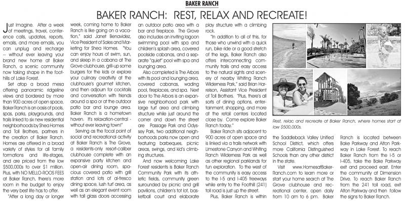 week, coming home to Baker Ranch is like going on a vacation,” said Janet Benavidez, Vice President of Sales and Marketing for Shea Homes. “You can enjoy hours of swim, sun, and sleep in a cabana at The Grove clubhouse,grill-up some burgers for the kids or explore your culinary creativity at the clubhouse’s gourmet kitchen, and then adjourn for cocktails and conversation with friends around aspa or at the outdoor patio bar and lounge area. Baker Ranch is a hometown haven. It’s relaxation-central - without ever leaving town!” Serving as the focal point of social and recreational activity at Baker Ranch is The Grove, a residents-only resort-caliber clubhouse complete with an expansive party kitchen and open-air dining room, spacious covered patio with grill station and lots of al-fresco dining space, lush turf area, as well as an elegant event room with tall glass doors accessing