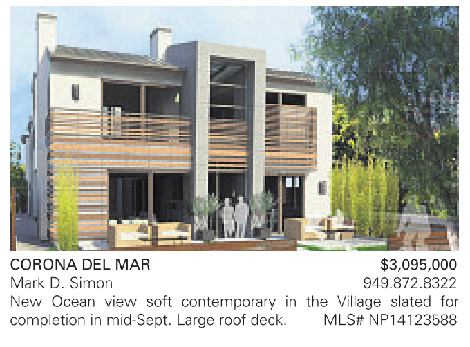 CORONA DEL MAR $3,095,000 Mark D. Simon 949.872.8322 New Ocean view soft contemporary in the Village slated for completion in mid-Sept. Large roof deck. MLS# NP14123588