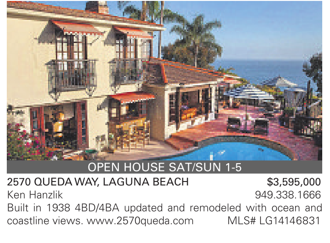 OPEN HOUSE SAT/SUN 1-5 2570 QUEDAWAY, LAGUNA BEACH $3,595,000 Ken Hanzlik 949.338.1666 Built in 1938 4BD/4BA updated and remodeled with ocean and coastline views. www.2570queda.com MLS# LG14146831