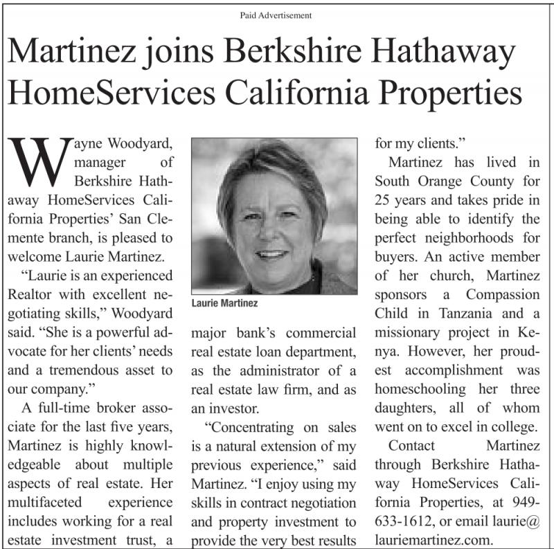 Wayne Woodyard, manager of Berkshire Hathaway HomeServices California Properties’ San Clemente branch, is pleased to welcome Laurie Martinez. “Laurie is an experienced Realtor with excellent negotiating skills,” Woodyard said. “She is a powerful advocate for her clients’ needs and a tremendous asset to our company.” A full-time broker associate for the last five years, Martinez is highly knowledgeable about multiple aspects of real estate. Her multifaceted experience includes working for a real estate investment trust, a major bank’s commercial real estate loan department, as the administrator of a real estate law firm, and as an investor. “Concentrating on sales is a natural extension of my previous experience,” said Martinez. “I enjoy using my skills in contract negotiation and property investment to provide the very best results Paid Advertisement Martinez joins Berkshire Hathaway HomeServices California Properties Laurie Martinez for my clients.” Martinez has lived in South Orange County for 25 years and takes pride in being able to identify the perfect neighborhoods for buyers. An active member of her church, Martinez sponsors a Compassion Child in Tanzania and a missionary project in Kenya. However, her proudest accomplishment was homeschooling her three daughters, all of whom went on to excel in college. Contact Martinez through Berkshire Hathaway HomeServices California Properties, at 949- 633-1612, or email laurie@ lauriemartinez.com.