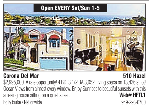 Corona Del Mar Open EVERY Sat/Sun 1-5 510 Hazel holly burke /Nationwide 949-298-0700 $2,995,000. Arareopportunity! 4BD, 31/2 BA 3,052 living space on 13,436 sf lot! Ocean Views from almost every window. Enjoy Sunrises to beautiful sunsets with this amazing house sitting on aquiet street. Web# HFTL1