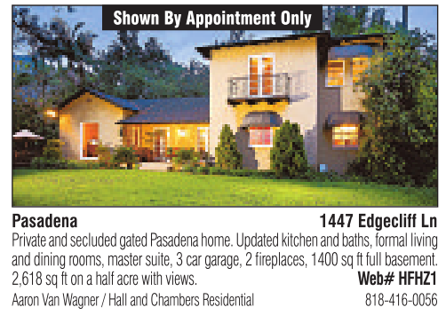Pasadena Shown By Appointment Only 1447 Edgecliff Ln Private and secluded gated Pasadena home. Updated kitchen and baths, formal living and dining rooms, master suite, 3car garage, 2fireplaces, 1400 sq ft full basement. 2,618 sq ft on ahalf acrewith views. Web# HFHZ1 Aaron VanWagner /Hall and Chambers Residential 818-416-0056
