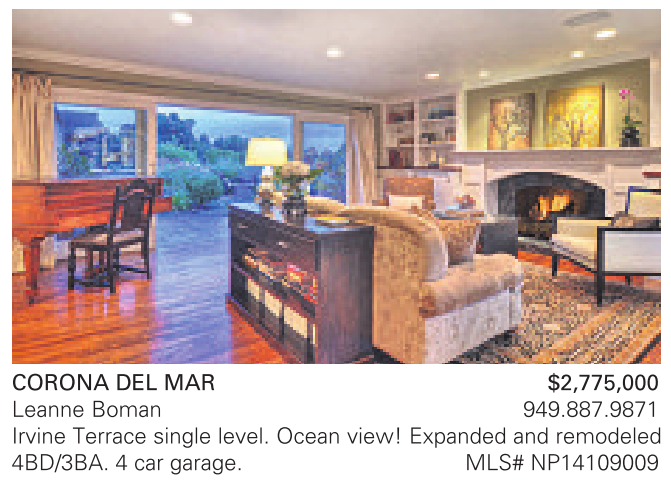 CORONA DEL MAR $2,775,000 Leanne Boman 949.887.9871 Irvine Terrace single level. Ocean view! Expanded and remodeled 4BD/3BA. 4 car garage. MLS# NP14109009
