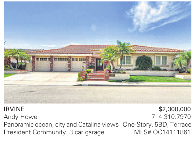 IRVINE $2,300,000 Andy Howe 714.310.7970 Panoramic ocean, city and Catalina views! One-Story, 5BD, Terrace President Community. 3 car garage. MLS# OC14111861