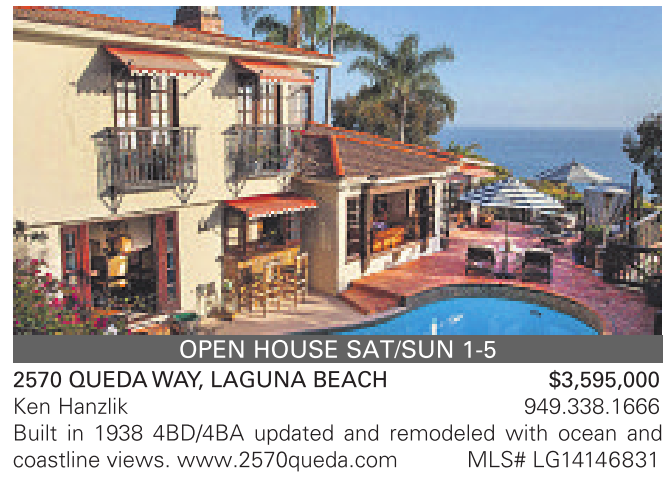 OPEN HOUSE SAT/SUN 1-5 2570 QUEDAWAY, LAGUNA BEACH $3,595,000 Ken Hanzlik 949.338.1666 Built in 1938 4BD/4BA updated and remodeled with ocean and coastline views. www.2570queda.com MLS# LG14146831