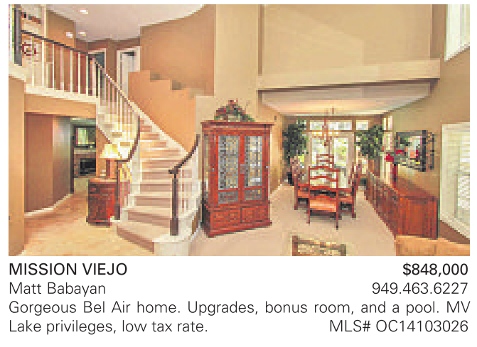 MISSION VIEJO $848,000 Matt Babayan 949.463.6227 Gorgeous Bel Air home. Upgrades, bonus room, and a pool. MV Lake privileges, low tax rate. MLS# OC14103026