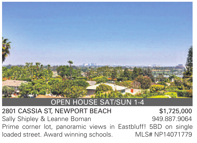 OPEN HOUSE SAT/SUN 1-4 2801 CASSIA ST, NEWPORT BEACH $1,725,000 Sally Shipley & Leanne Boman 949.887.9064 Prime corner lot, panoramic views in Eastbluff! 5BD on single loaded street. Award winning schools. MLS# NP14071779