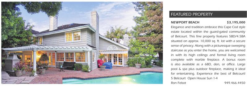 NEWPORT BEACH $3,195,000 Elegance and tradition embrace this Cape Cod style estate located within the guard-gated community of Belcourt. This fine property features 5BD/4.5BA situated on approx. 10,000 sq. ft. lot with a secure sense of privacy. Along with a picturesque sweeping staircase as you enter the home, you are welcomed in with its high ceilings and formal living room complete with marble fireplace. A bonus room is also available as a 6BD, den, or office. Large pool & spa plus outdoor fireplace, making it ideal for entertaining. Experience the best of Belcourt! 5 Belcourt Open House Sun 1-4 Ron Felsot 949.466.4450