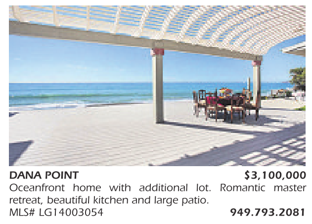 DANA POINT $3,100,000 Oceanfront home with additional lot. Romantic master retreat, beautiful kitchen and large patio. MLS# LG14003054 949.793.2081