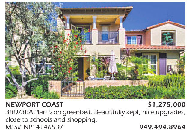 NEWPORT COAST $1,275,000 3BD/3BA Plan 5ongreenbelt. Beautifully kept, nice upgrades, close to schools and shopping. MLS# NP14146537 949.494.8964
