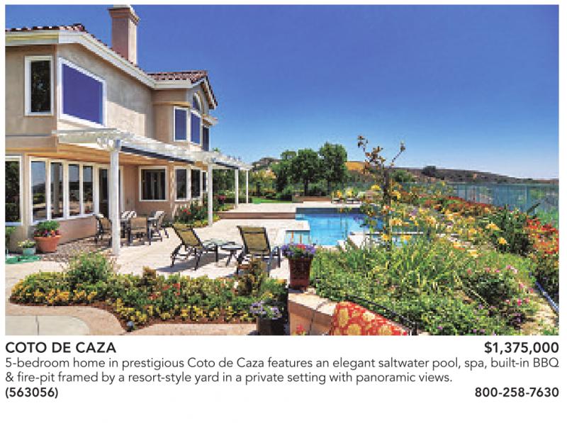 COTO DE CAZA $1,375,000 5-bedroom home in prestigiousCotodeCazafeaturesanelegantsaltwater pool,spa,built-inBBQ &fire-pit framedbyaresort-styleyardinaprivate settingwithpanoramic views. (563056) 800-258-7630