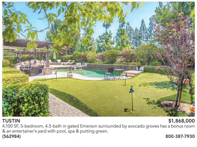 TUSTIN $1,868,000 4,100SF, 5-bedroom,4.5-bathingated Emersonsurrounded by avocadogroveshas abonus room &anentertainer’syardwithpool, spa&putting green. (562984) 800-387-7930