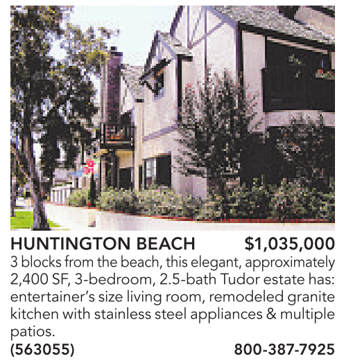 HUNTINGTON BEACH $1,035,000 3blocksfromthe beach, this elegant, approximately 2,400SF, 3-bedroom,2.5-bathTudor estate has: entertainer’s size living room,remodeled granite kitchenwithstainless steelappliances&multiple patios. (563055) 800-387-7925