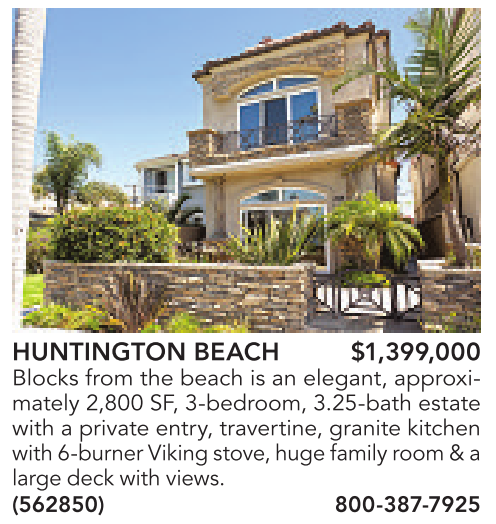 HUNTINGTON BEACH $1,399,000 Blocks from the beach is an elegant, approximately 2,800 SF, 3-bedroom, 3.25-bath estate with a private entry, travertine, granite kitchen with 6-burner Viking stove,hugefamilyroom &a largedeckwithviews. (562850) 800-387-7925