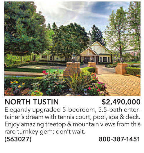 NORTH TUSTIN $2,490,000 Elegantlyupgraded5-bedroom,5.5-bathentertainer’s dreamwithtenniscourt,pool, spa&deck.