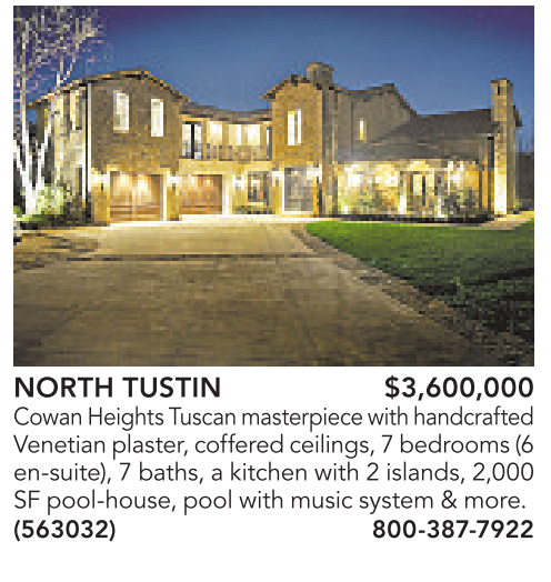 NORTH TUSTIN $3,600,000 CowanHeights Tuscan masterpiecewithhandcrafted Venetian plaster, coffered ceilings, 7bedrooms(6 en-suite), 7baths,akitchen with 2islands, 2,000 SF pool-house,poolwithmusicsystem&more. (563032) 800-387-7922
