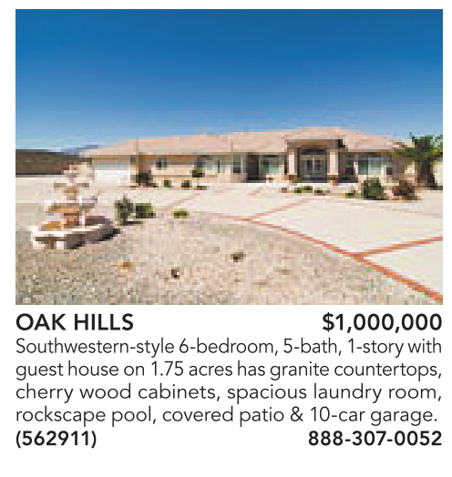 OAK HILLS $1,000,000 Southwestern-style 6-bedroom,5-bath, 1-storywith guesthouse on 1.75 acreshas granitecountertops, cherry wood cabinets, spacious laundry room, rockscapepool, coveredpatio &10-cargarage. (562911) 888-307-0052