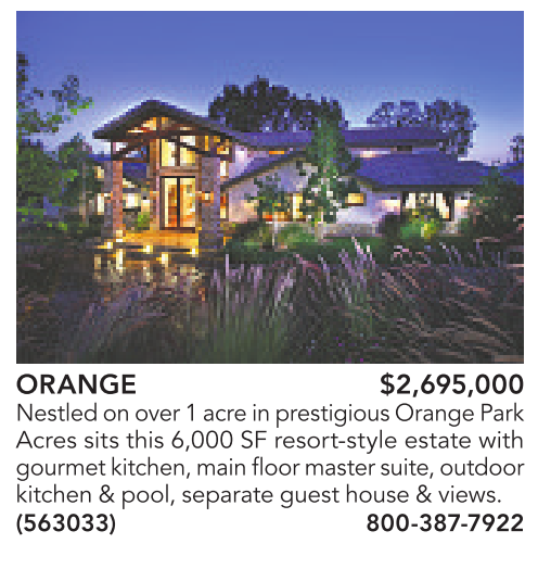ORANGE $2,695,000 Nestledonover1acreinprestigious Orange Park Acres sits this 6,000 SF resort-style estate with gourmet kitchen, main floor master suite, outdoor kitchen&pool, separate guesthouse &views. (563033) 800-387-7922