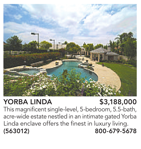 YORBA LINDA $3,188,000 This magnificentsingle-level,5-bedroom,5.5-bath, acre-wideestatenestled in an intimategated Yorba Linda enclaveoffersthe finestinluxuryliving. (563012) 800-679-5678