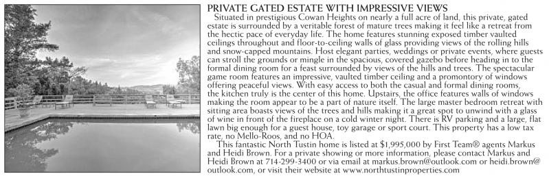 This fantastic North Tustin home is listed at $1,995,000 by First Team® agents Markus and Heidi Brown. For a private showing or more information, please contact Markus and Heidi Brown at 714-299-3400 or via email at markus.brown@outlook.com or heidi.brown@ outlook.com, or visit their website at www.northtustinproperties.com