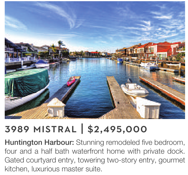 Huntington Harbour: Stunning remodeled five bedroom, four and a half bath waterfront home with private dock. Gated courtyard entry, towering two-story entry, gourmet kitchen, luxurious master suite.