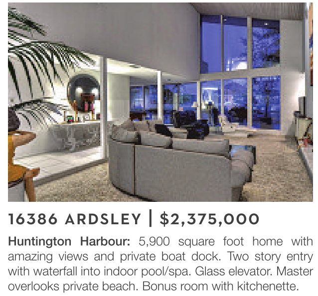 Huntington Harbour: 5,900 square foot home with amazing views and private boat dock. Two story entry with waterfall into indoor pool/spa. Glass elevator. Master overlooks private beach. Bonus room with kitchenette.