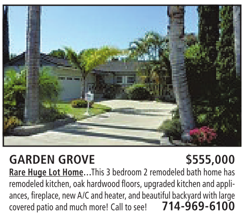 GARDEN GROVE $555,000 Rare Huge Lot Home…This 3bedroom 2remodeled bath home has remodeledkitchen,oak hardwood floors,upgraded kitchen andappliances, fireplace,new A/Cand heater,and beautifulbackyard with large coveredpatio andmuch more!Calltosee! 714-969-6100