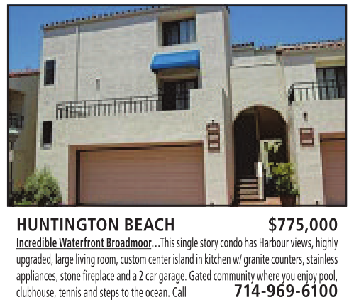 HUNTINGTON BEACH $775,000 Incredible Waterfront Broadmoor…This singlestorycondohas Harbour views, highly upgraded, large living room,customcenter island in kitchen w/ granite counters, stainless appliances, stone fireplace anda2car garage. Gated communitywhere youenjoy pool, clubhouse, tennis andsteps to theocean.Call 714-969-6100