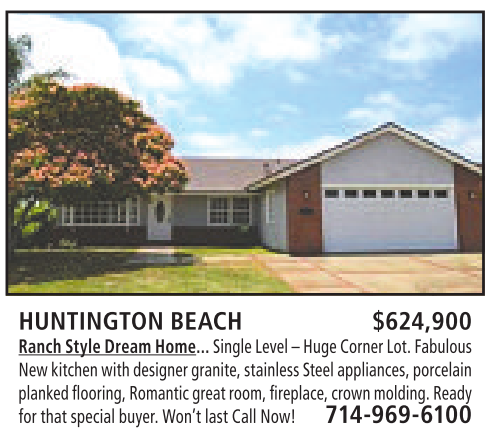 HUNTINGTON BEACH $624,900 RanchStyle Dream Home... Single Level–HugeCorner Lot. Fabulous Newkitchen with designer granite,stainlessSteel appliances, porcelain planked flooring,Romanticgreat room,fireplace, crown molding.Ready for that specialbuyer.Won’t last Call Now! 714-969-6100
