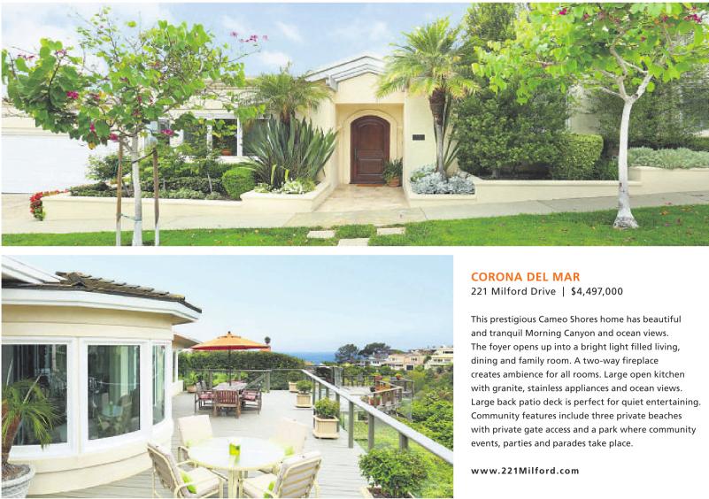 CORONA DEL MAR 221 Milford Drive | $4,497,000 This prestigious Cameo Shores home has beautiful and tranquil Morning Canyon and ocean views. The foyer opens up into a bright light filled living, dining and family room. A two-way fireplace creates ambience for all rooms. Large open kitchen with granite, stainless appliances and ocean views. Large back patio deck is perfect for quiet entertaining. Community features include three private beaches with private gate access and a park where community events, parties and parades take place. www.221Milford.com