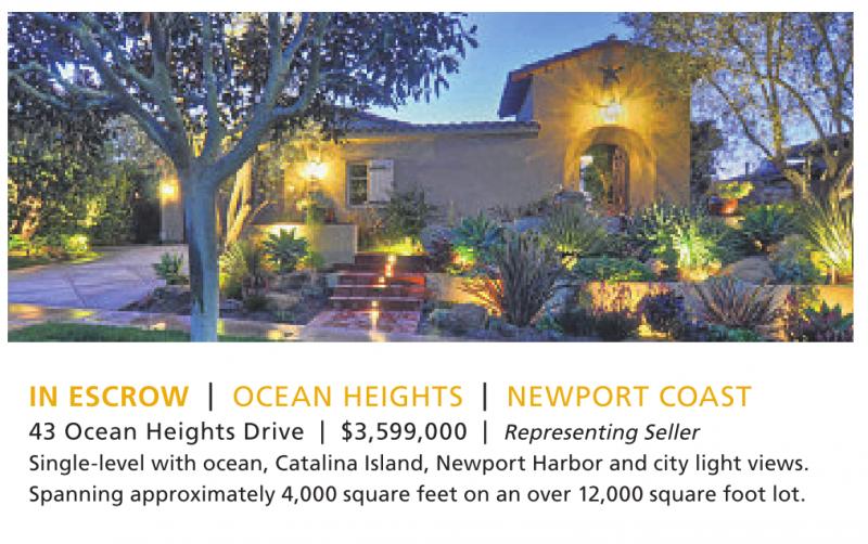 IN ESCROW | OCEAN HEIGHTS | NEWPORT COAST 43 Ocean Heights Drive | $3,599,000 | Representing Seller Single-level with ocean, Catalina Island, Newport Harbor and city light views. Spanning approximately 4,000 square feet on an over 12,000 square foot lot. See also