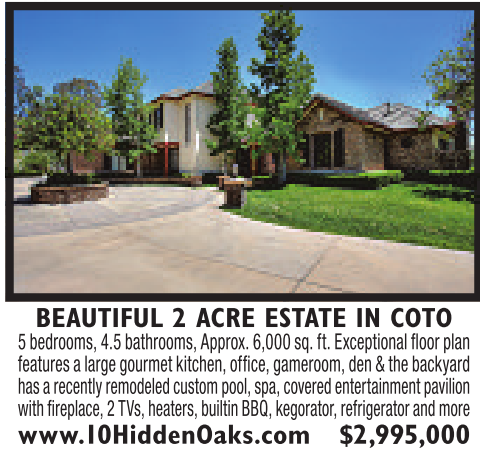 BEAUTIFUL 2 ACRE ESTATE IN COTO 5bedrooms,4.5 bathrooms,Approx.6,000 sq.ft. Exceptionalfloorplan features alargegourmet kitchen, office, gameroom, den &the backyard hasarecentlyremodeledcustompool, spa,covered entertainmentpavilion with fireplace,2TVs,heaters,builtinBBQ,kegorator,refrigerator andmore www.10HiddenOaks.com $2,995,000