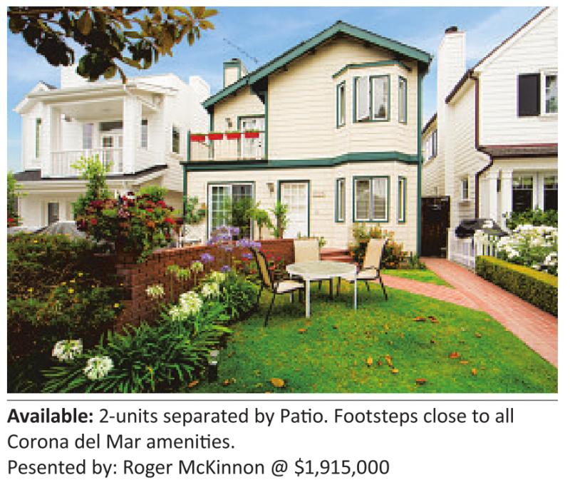 Available: 2-units separated by Pa o. Footsteps close to all Corona del Mar ameni es. Pesented by: Roger McKinnon @ $1,915,000