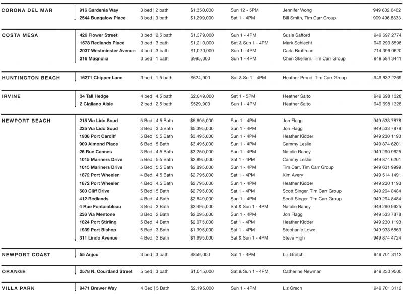 NEWPORT BEACH 215 Via Lido Soud 5 Bed | 4.5 Bath $5,695,000 Sun 1 - 4PM Jon Flagg 949 533 7878 225 Via Lido Soud 3 Bed | 3 .5Bath $5,395,000 Sun 1 - 4PM Jon Flagg 949 533 7878 1938 Port Cardiff 5 Bed | 5.5 Bath $3,495,000 Sun 1 - 4PM Heather Kidder 949 230 1193 909 Almond Place 6 Bed | 5 Bath $3,495,000 Sun 1 - 4PM Cammy Leslie 949 874 6201 26 Rue Cannes 3 Bed | 4.5 Bath $3,250,000 Sun 1 - 4PM Natalie Raney 949 290 9625 1015 Mariners Drive 5 Bed | 5.5 Bath $2,895,000 Sat 1 - 4PM Cammy Leslie 949 874 6201 1015 Mariners Drive 5 Bed | 5.5 Bath $2,895,000 Sun 1 - 4PM Tim Carr, Tim Carr Group 949 631 9999 1872 Port Wheeler 4 Bed | 4.5 Bath $2,795,000 Sat 1 - 4PM Kim Avery 949 514 1491 1872 Port Wheeler 4 Bed | 4.5 Bath $2,795,000 Sun 1 - 4PM Heather Kidder 949 230 1193 500 Cliff Drive 5 Bed | 5 Bath $2,795,000 Sat 1 - 4PM Scott Singer, Tim Carr Group 949 294 8484 412 Redlands 4 Bed | 4 Bath $2,649,000 Sun 1 - 4PM Scott Singer, Tim Carr Group 949 294 8484 4 Rue Fontainbleau 3 Bed | 3 Bath $2,495,000 Sat & Sun 1 - 4PM Natalie Raney 949 290 9625 236 Via Mentone 3 Bed | 2 Bath $2,095,000 Sun 1 - 4PM Jon Flagg 949 533 7878 1824 Port Stirling 5 Bed | 4 Bath $2,075,000 Sat 1 - 4PM Heather Kidder 949 230 1193 1939 Port Bishop 5 Bed | 3 Bath $1,995,000 Sat 1 - 4PM Stephanie Lowe 949 933 5863 311 Lindo Avenue 4 Bed | 3 Bath $1,995,000 Sat & Sun 1 - 4PM Steve High 949 874 4724