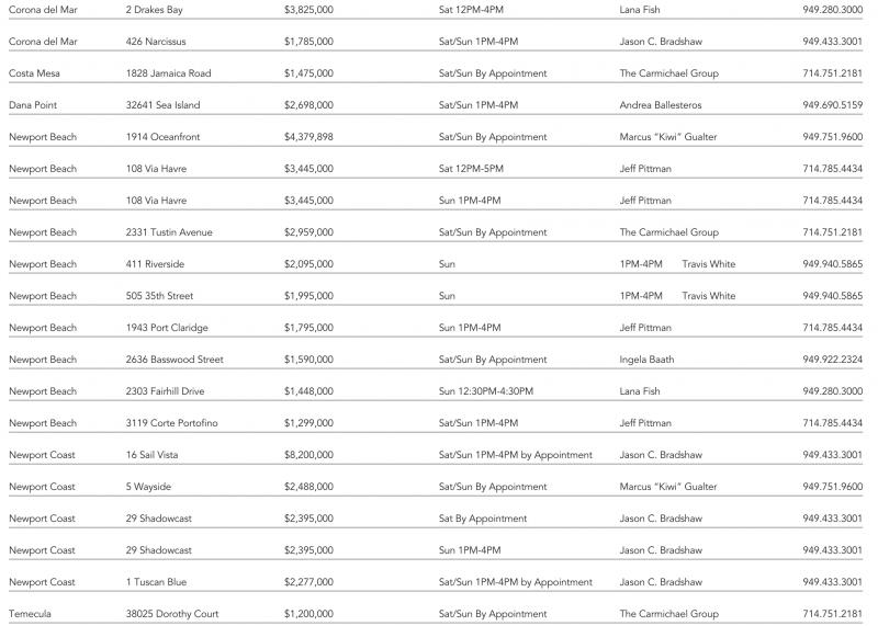 Newport Coast 29 Shadowcast $2,395,000 Sat By Appointment Jason C. Bradshaw 949.433.3001