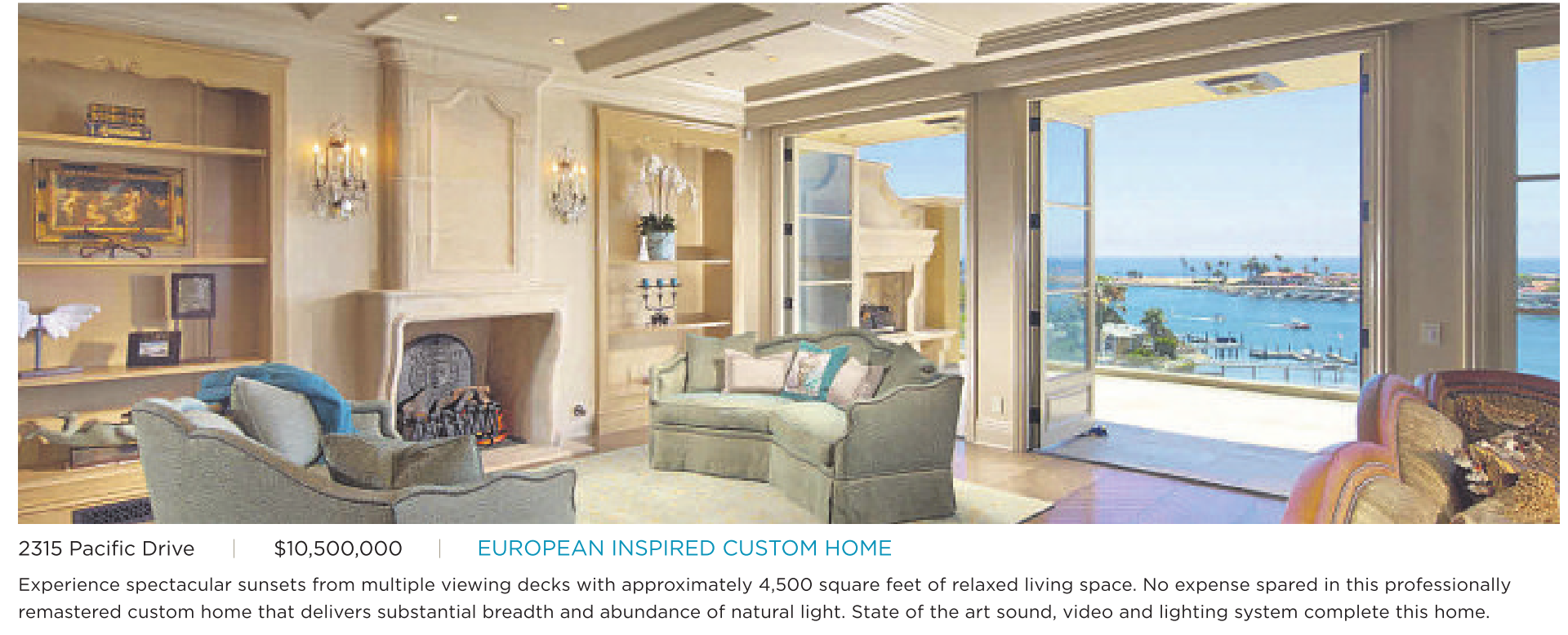 2315 Pacific Drive | $10,500,000 | EUROPEAN INSPIRED CUSTOM HOME Experience spectacular sunsets from multiple viewing decks with approximately 4,500 square feet of relaxed living space. No expense spared in this professionally remastered custom home that delivers substantial breadth and abundance of natural light. State of the art sound, video and lighting system complete this home.