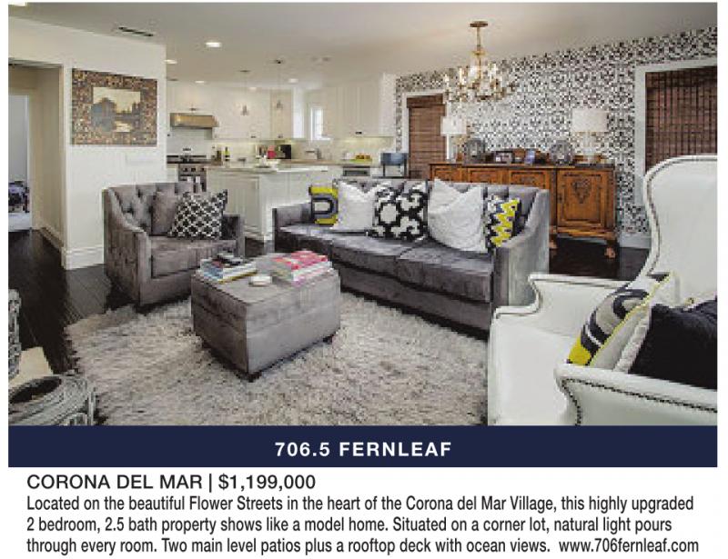 706.5 FERNLEAF CORONA DEL MAR | $1,199,000 Located on the beautiful Flower Streets in the heart of the Corona del Mar Village, this highly upgraded 2bedroom, 2.5 bath property shows like amodel home. Situated on acorner lot, natural light pours through every room. Twomain level patios plus arooftop deck with ocean views. www.706fernleaf.com