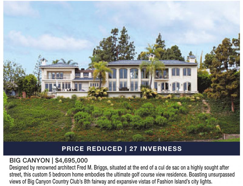 BIG CANYON | $4,695,000 Designed by renowned architect Fred M. Briggs, situated at the end of acul de sac on ahighly sought after street, this custom 5bedroom home embodies the ultimate golf course view residence. Boasting unsurpassed views of Big Canyon Country Club’s 8th fairway and expansive vistas of Fashion Island’s city lights.