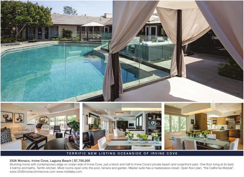 T E R R I F I C N E W L I S T I N G O C E A N S I D E O F I R V I N E C O V E 2526 Monaco, Irvine Cove, Laguna Beach | $7,700,000 Stunning home with contemporary edge on ocean side of Irvine Cove, just a block and half to Irvine Cove’s private beach and oceanfront park. One floor living at its best. 4 bdrms and baths. Terrific kitchen. Most rooms open onto the pool, terrace and garden. Master suite has a masterpiece closet. Open floor plan, “the California lifestyle”. www.2526monacoirvinecove.com www.roddaley.com.