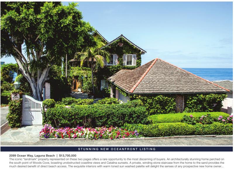 2099 Ocean Way, Laguna Beach | $13,700,000 The iconic “landmark” property represented on these two pages offers a rare opportunity to the most discerning of buyers. An architecturally stunning home perched on the south point of Woods Cove, boasting unobstructed coastline views and Catalina sunsets. A private, winding stone staircase from the home to the sand provides the much desired benefit of direct beach access. The exquisite interiors with warm toned sun washed palette will delight the senses of any prospective new home owner...
