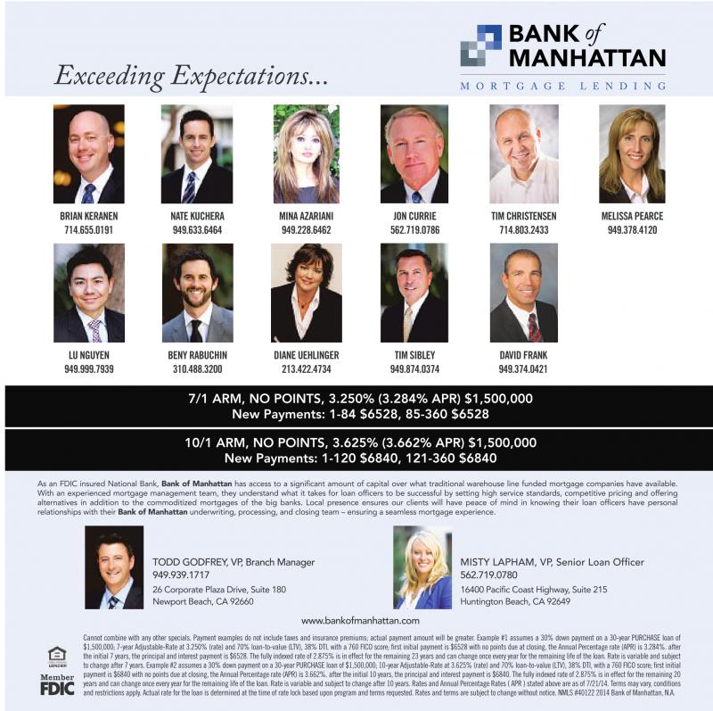Cannot combine with any other specials. Payment examples do not include taxes and insurance premiums; actual payment amount will be greater.Example #1 assumes a30% down payment on a30-year PURCHASE loan of $1,500,000; 7-year Adjustable-Rate at 3.250% (rate) and 70% loan-to-value (LTV), 38% DTI, with a760 FICO score; first initial payment is $6528 with no points due at closing, the Annual Percentage rate (APR) is 3.284%. after the initial 7years, the principal and interest payment is $6528. The fully indexed rate of 2.875% is in effect for the remaining 23 years and can change once every year for the remaining life of the loan. Rate is variable and subject to change after 7years. Example #2 assumes a30% down payment on a30-year PURCHASE loan of $1,500,000; 10-year Adjustable-Rate at 3.625% (rate) and 70% loan-to-value (LTV), 38% DTI, with a760 FICO score; first initial payment is $6840 with no points due at closing, the Annual Percentage rate (APR) is 3.662%. after the initial 10 years, the principal and interest payment is $6840. The fully indexed rate of 2.875% is in effect for the remaining 20 years and can change once every year for the remaining life of the loan. Rate is variable and subject to change after 10 years. Rates and Annual Percentage Rates (APR )stated above are as of 7/21/14. Terms may vary,conditions and restrictions apply.Actual rate for the loan is determined at the time of rate lock based upon program and terms requested. Rates and terms are subject to change without notice. NMLS #40122 2014 Bank of Manhattan, N.A.