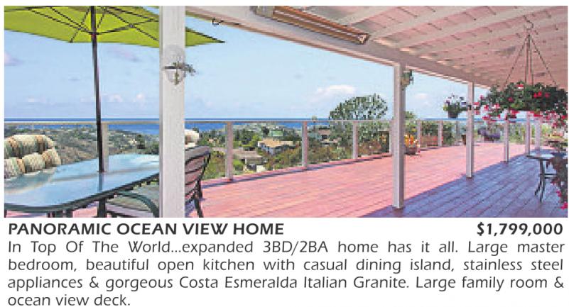 PANORAMIC OCEAN VIEW HOME $1,799,000 In Top Of The World...expanded 3BD/2BA home has it all. Large master bedroom, beautiful open kitchen with casual dining island, stainless steel appliances & gorgeous Costa Esmeralda Italian Granite. Large family room & ocean view deck.
