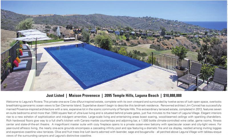 Just Listed | Maison Provenece | 2095 Temple Hills, Laguna Beach | $10,888,888 Welcome to Laguna’s Riviera.This private one-acre Cote d’Azur-inspired estate, complete with its own vineyard and surrounded by twelve acres of lush open space, overlooks breathtaking panoramic ocean views to San Clemente Island. Superlative doesn’t begin to describe this landmark residence. Renowned architect Jim Conrad has successfully married Provence-inspired architecture with arare, expansivelot in the scenic communityofTemple Hills.This extraordinaryterraced estate, completed in 2013,features seven en-suite bedrooms amid more than 7,000 square feet of ultra-luxe living and is situated behind private gates, just five minutes to the heart of Laguna Village. Elegant interiors rise to a new echelon of sophistication and indulgent amenities. Large-scale living and entertaining areas boast soaring, wood-beamed ceilings with sparkling chandeliers. Rich hardwood floors give way to a full chef’s kitchen with Carrara marble countertops and adjoining bar, a 1,500 bottle climate-controlled wine cellar, game rooms, fitness center and state-of-the-art theatre. A magnificent master suite with cozy fireplace opens to a private ocean-view balcony with spectacular ocean and city-light views. For year-round alfresco living, the nearly one-acre grounds encompass OPEN a cascading HOUSE infinity pool SATand 1 - 4 pm spa featuring a dramatic fire and ice display, nestled among inviting loggias and expansive coastline view terraces. Olive and fruit trees line lush lawns adorned with lavender, sage and bouganvilla - all perched above Laguna Village with tableau-esque views of the surrounding canyons and Laguna’s distinctive coastline.
